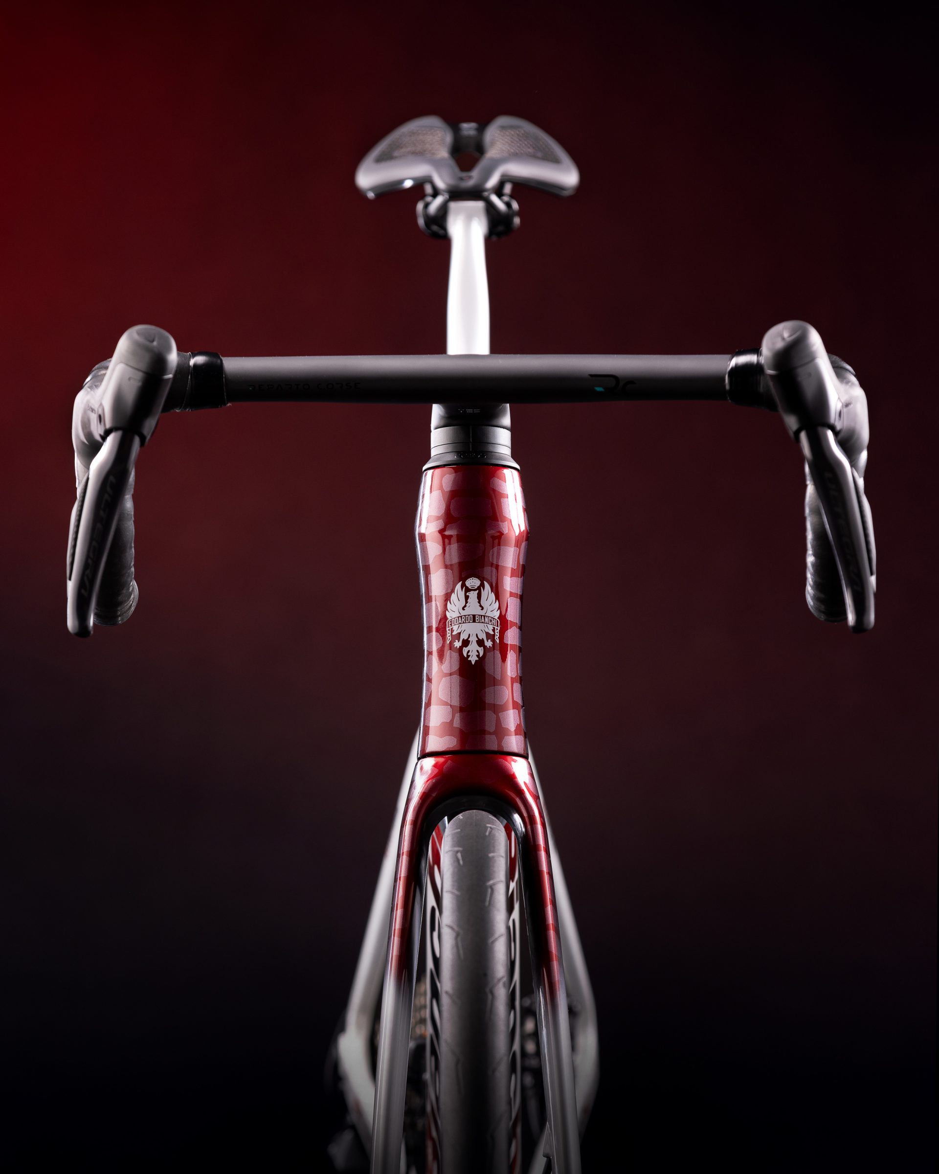 - Mostek i kierownica: zintegrowany karbonowy kokpit Bianchi Reparto Corse.