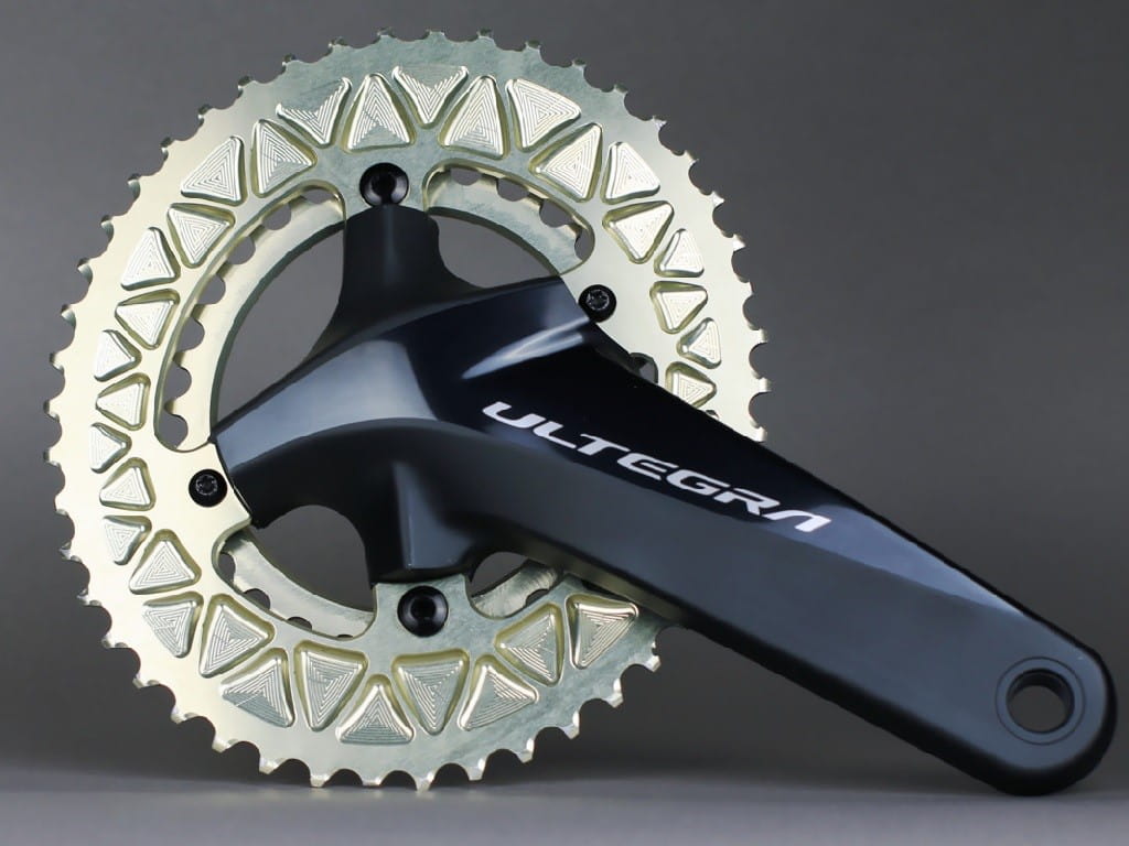 - Najlepiej współpracujące z przednią przerzutka owalne zębatki na rynku – wewnątrz zębatki umieszczono sześć odpowiednio ukształtowanych prowadnic które ułatwią przeniesienie łańcucha z mniejszej na większą tarczę