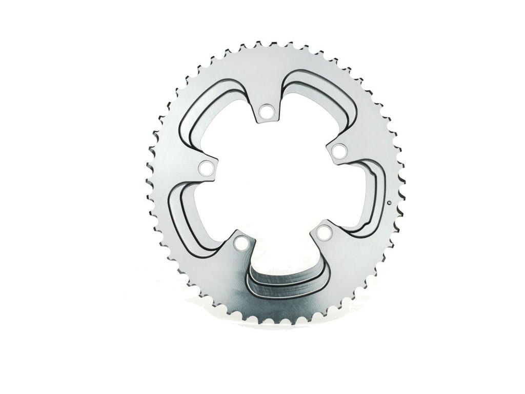 - Najlepiej współpracujące z przednią przerzutka owalne zębatki na rynku – wewnątrz zębatki umieszczono sześć odpowiednio ukształtowanych prowadnic które ułatwią przeniesienie łańcucha z mniejszej na większą tarczę