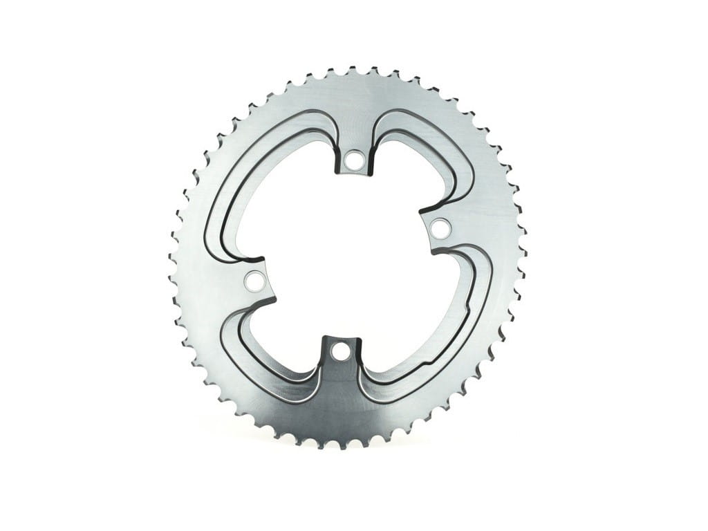 - Najlepiej współpracujące z przednią przerzutka owalne zębatki na rynku – wewnątrz zębatki umieszczono sześć odpowiednio ukształtowanych prowadnic które ułatwią przeniesienie łańcucha z mniejszej na większą tarczę