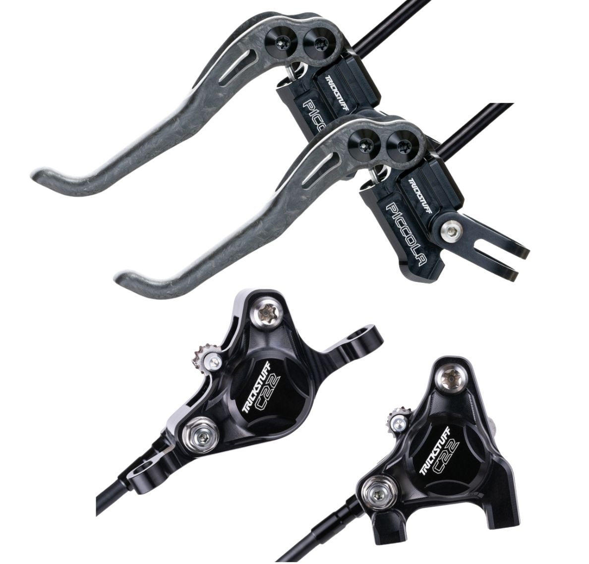 Piccola Carbon jest wyposażona w odporne na zeszklenie klocki hamulcowe Trickstuff 830 „Power-Alu". Dzięki szczelinie 0,2 mm między klockiem a tarczą, ryzyko ocierania tarcz hamulcowych jest minimalne. Zacisk hamulca C22 jest kompatybilny z tarczami o grubości do 2,1 mm, a dla najlepszej wydajności producent zaleca stosowanie tarcz hamulcowych Trickstuff Dächle.